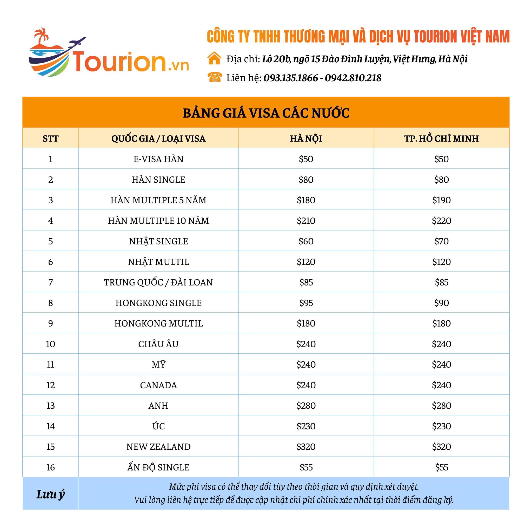 Tham khảo ngay bảng giá visa du lịch kèm theo và chọn gói dịch vụ phù hợp. Ngoài visa du lịch, Tourion còn hỗ trợ nhiều loại visa khác: công tác, thăm thân, du học..
