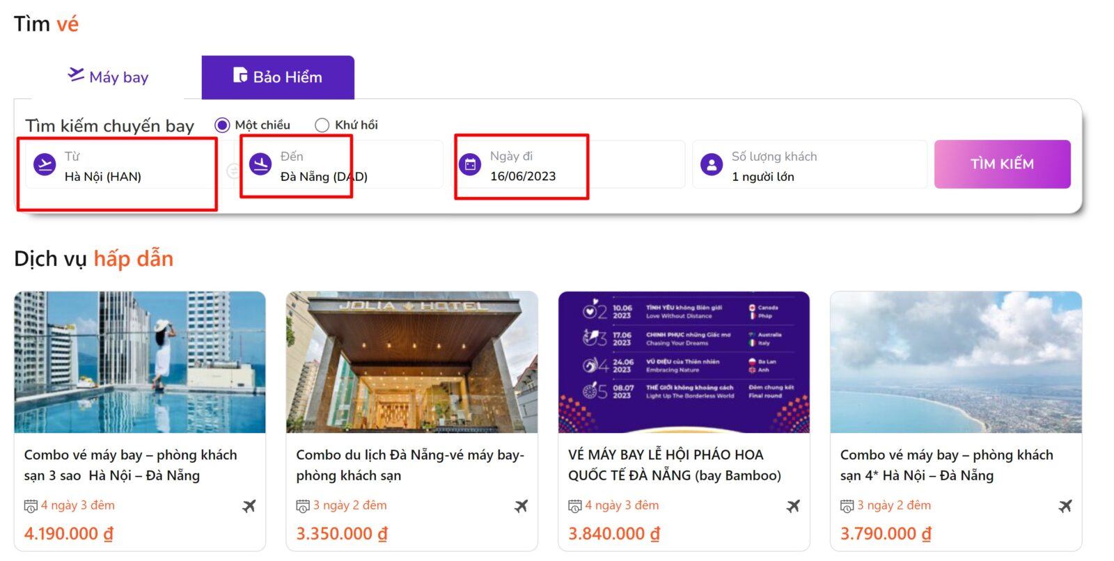 Ví dụ như mình thử chuyển sang ngày 19 đã có vé rẻ hơn bạn có thể nhìn thấy Vé máy bay Vietjet, Bamboo, Vietravel giá rẻ đi Đà Nẵng tháng 6/2023 trong phần tìm kiếm của Tourion: