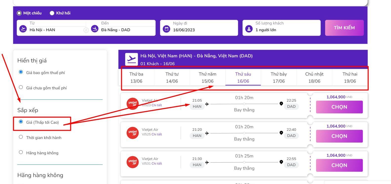 Bước tiếp theo bạn sẽ tới được giao diện của trang tìm vé. ở đây bạn chú ý mục sắp xếp và muc phía trên gồm các ngày. Như ở đây là ngày 16, bạn có thể chuyển sang các ngày khác để check vé: